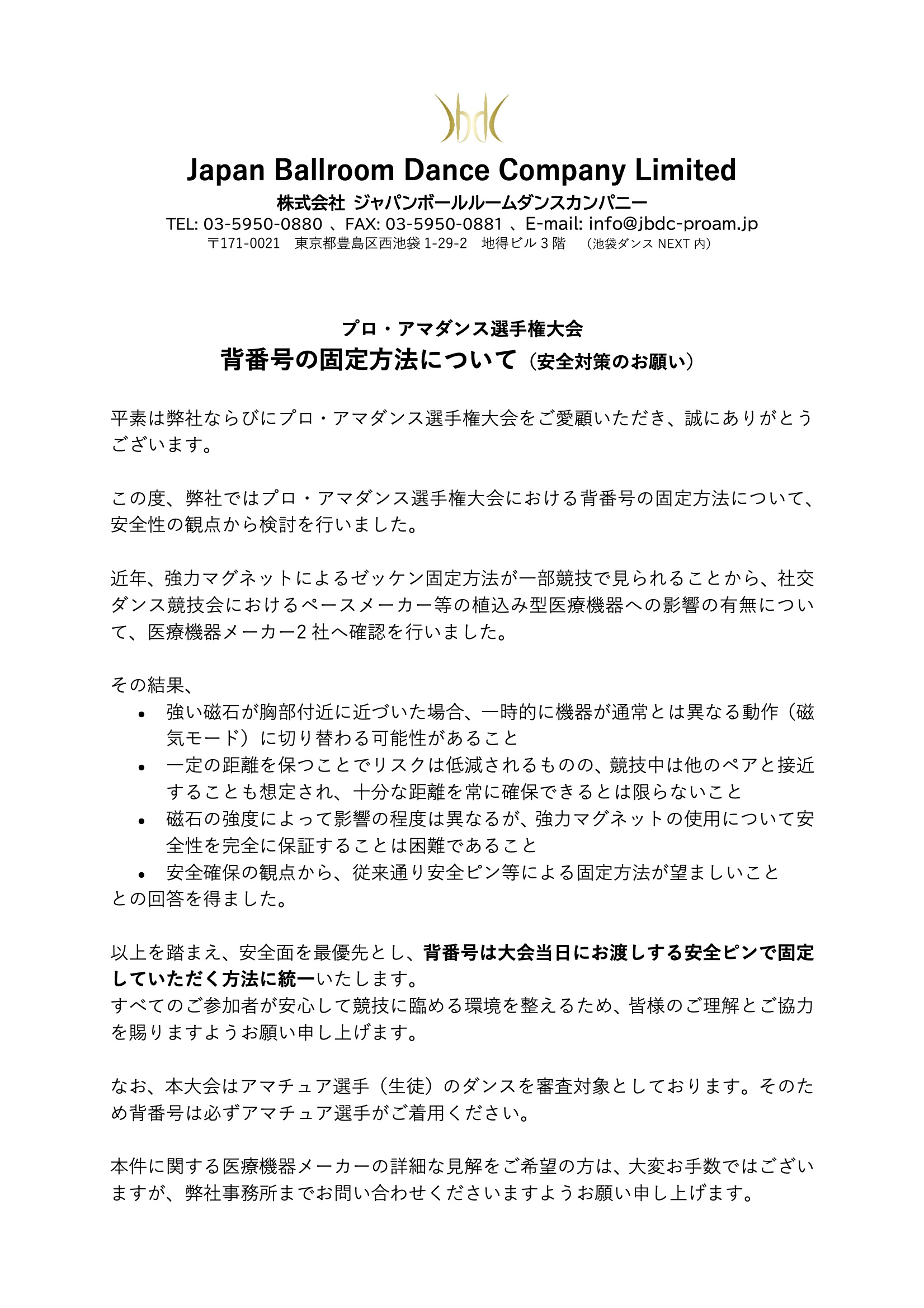 この度、弊社ではプロ・アマダンス選手権大会における背番号の固定方法について、安全性の観点から検討を行いました。